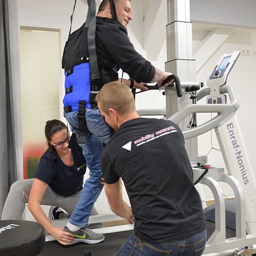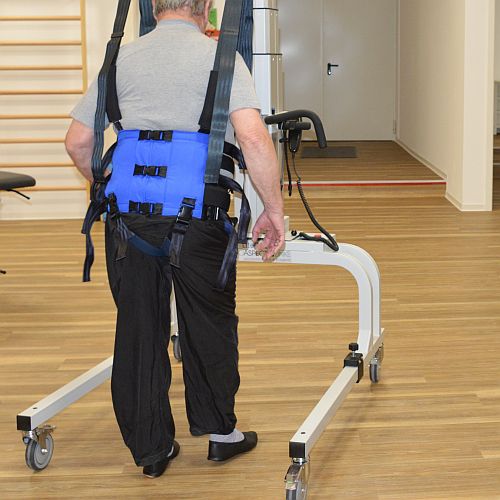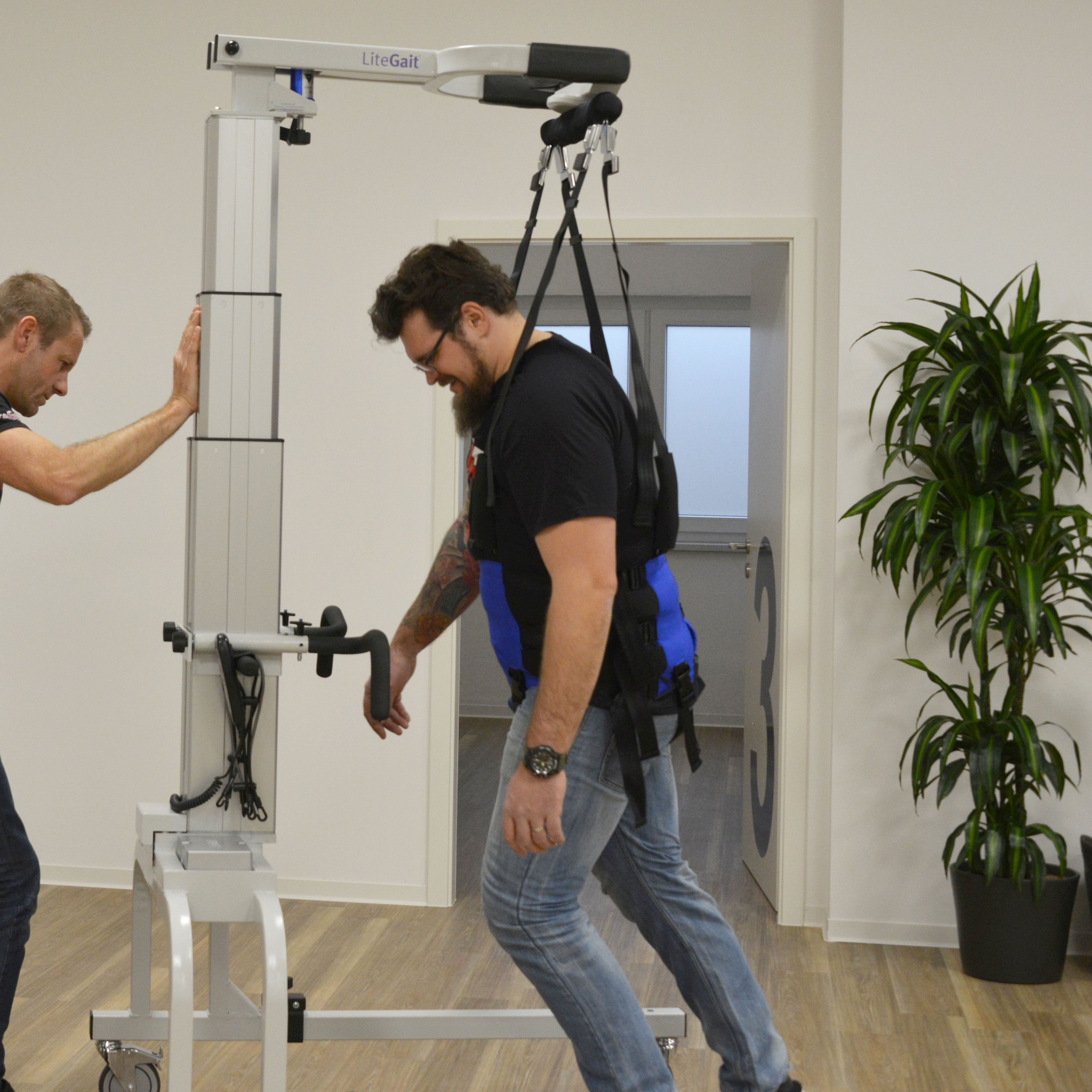 Gesichertes Geh- und Laufband-Training ist möglich (aktiv/passiv).