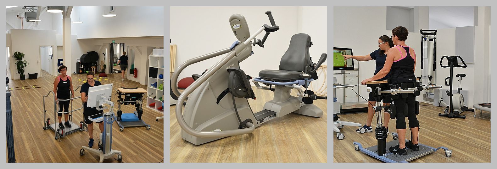 Die Arbeit mit den geeigneten Geräten bedeutet für uns, für die Patienten die geeigneten Trainingsmöglichkeiten auf der Fläche, auf der Matte und am Gerät zu kombinieren. Dabei können wir auf Geräte zurückgreifen, die auch für Patienten mit stärkeren Einschränkungen in der Beweglichkeit, Gehfähigkeit oder Leistungsfähigkeit geeignet sind. Nachweisbare Erfolge in der Gehtherapie, speziell auch bei neurologischen Krankheitsbildern, setzen in der Rehabilitation eine hohe Intensität und eine hohe Wiederholungsrate des Trainings voraus.