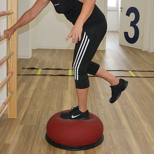Ein Balance-Training ist Bestandteil der Sturzprophylaxe und wird häufig auch in Verbindung mit einem Gangtraining durchgeführt.
